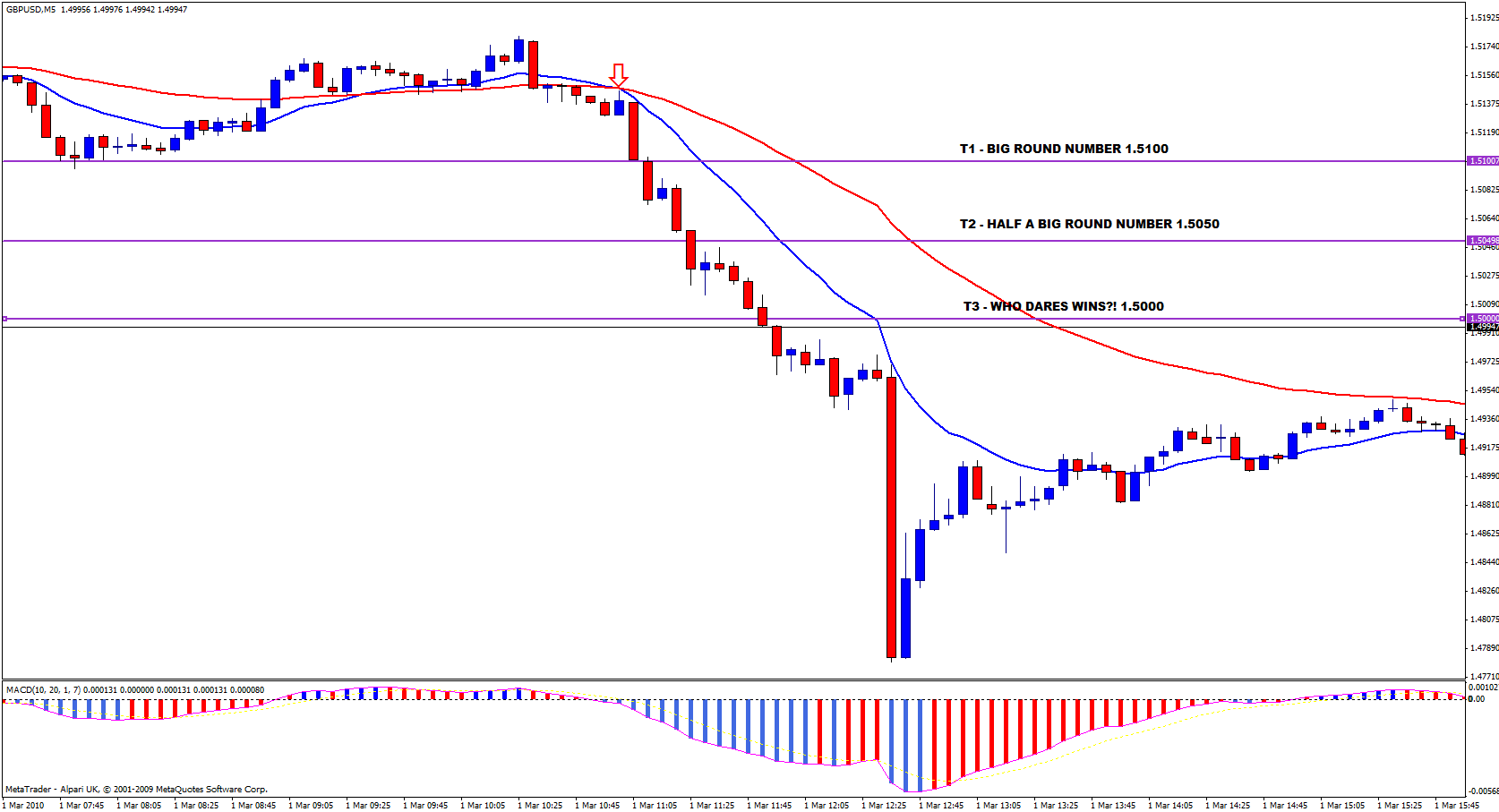 Scaling out of the position on the way down, I took half my stake at 1.5105 (after numerous error messages and the platform freezing again – sigh). I actually closed out the trade by mistake at 1.5039. What I was trying to do was scale out and just leave a little shrapnel on the table to see what else I could scoop out of the market BUT in my frustation with Metatrader and continually getting error messages and frozen platform syndrome I forgot to amend the stake amount and so the trade was closed at 1.5039 for just shy of 100 pips.
