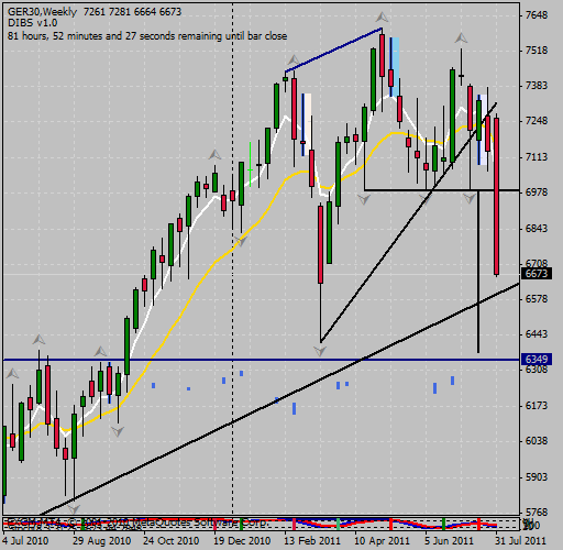 By now I hope you can see the Head & Shoulders set-up. There is a rather aggressive neckline if you use the diagonal trendline however there was a nice horizontal support line around 6990 which has broken and I have taken that for a projection which gives a price of approx 6350, which is also a previous resistance line so may well make a good area of support.
