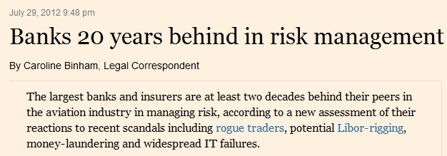 As the Corven piece points out there appears to be a very different culture with the Banking sector. Whereas the Aviation Industry is very pro-active in managing risk the Banks appears to be demonstrably reactive to the task. Why is that? Is it culture, is it incompetence, is it wilful negligence, or is it purely an accepted risk that things will go badly wrong? Have the numbers got so big that people are just dis-connected from the reality of it all?